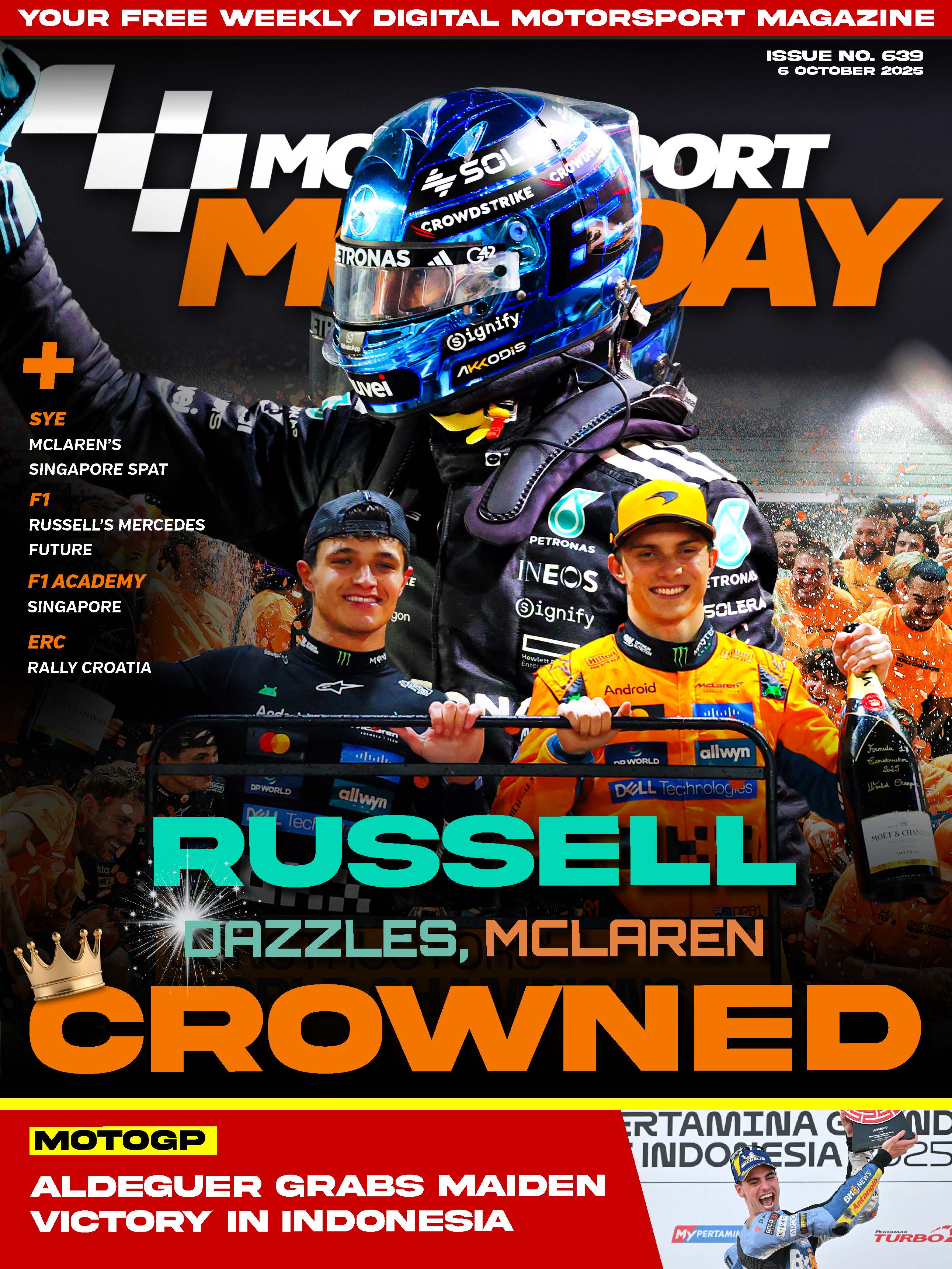Headlining this week’s edition is the Singapore Grand Prix, where George Russell took charge to pick up the win on a night where McLaren were crowned FIA Formula 1 Constructors’ Champions, again. Graham Harris, Taylor Powling and Jack Smith report, while James Moy snapped the images. McLaren’s achievement was overshadowed somewhat by Lando Norris and Oscar Piastri banging wheels on the opening lap, an incident which is poised to spice up the Drivers’ Championship, as Taylor and Jack discuss in this week’s Start Your Engines. Meanwhile, James Phillips suggests that Russell’s dominant showing has ensured that he holds the cards in his ongoing contractual negotiations with Mercedes. Accompanying F1 at the Marina Bay Street Circuit was F1 Academy. Lia Block took her first ever track win on Saturday and Maya Weug ensured the title battle with Dorian Pin will go down to the wire next month in Las Vegas on Sunday. Tiana Soans covers the all-female series’ latest billing. Elsewhere, Marc Marquez and the factory Ducati team were not at the races as the FIM MotoGP season continued in Indonesia, allowing Fermin Aldeguer to snatch his maiden victory. Henry Cheal and Eden Hannigan covered the weekend’s action. The FIA European Rally Championship concluded yesterday with Rally Croatia, which saw Jon Armstrong win the battle, but Miko Marczyk and Szymon Gospodarczyk took the spoils in 2025. David Ledbitter reports. And, as always, we have all the usual news, views and stories in this week's edition of the most widely read weekly motorsport magazine in the world!